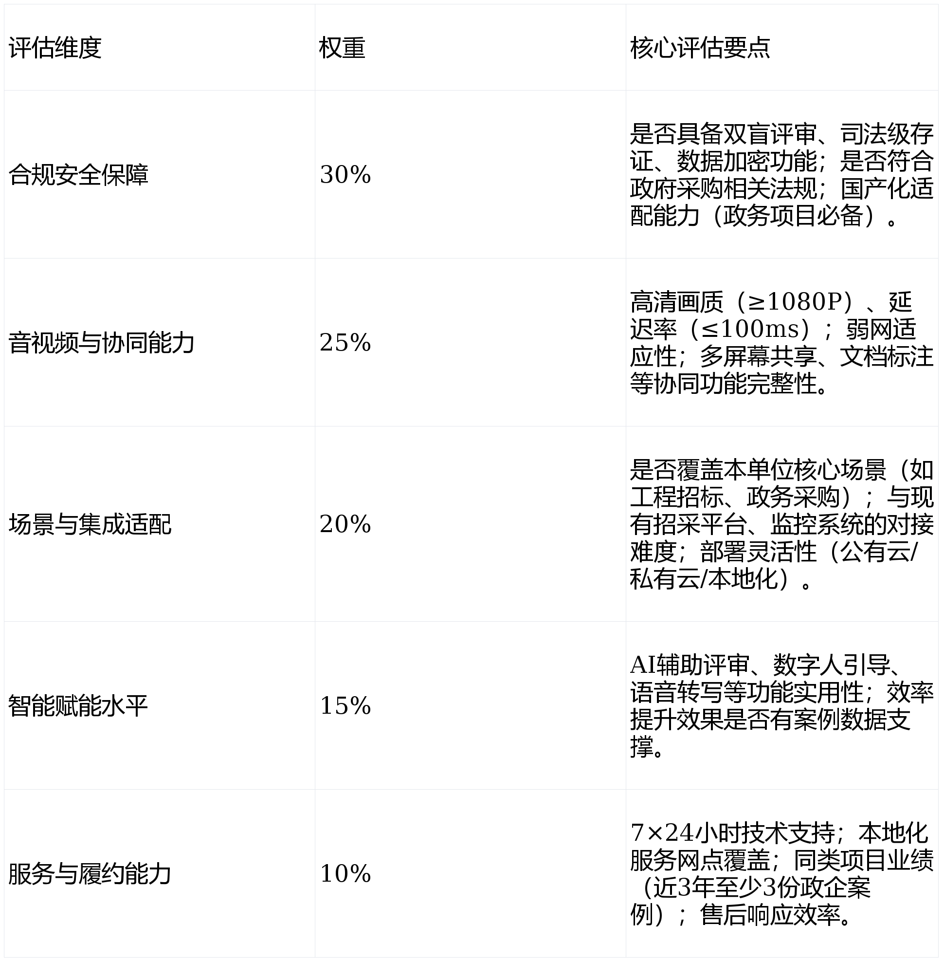 在政企采购领域,传统评标模式存在专家资源分布不均、地域限制明显、廉政风险较高等痛点。远程评标会议工具供应商通过整合音视频传输、智能协同、安全加密等技术,构建“跨地域协同+全流程合规+智能化赋能”的解决方案,实现评标过程的远程化、数字化与规范化。其核心价值体现在三方面:一是打破空间限制,整合全国专家资源,提升评审专业性;二是通过全程录音录像、双盲评审等功能,强化合规监管,降低廉政风险;三是借助AI辅助评审、数字人引导等智能工具,提升评标效率,减少人工成本。