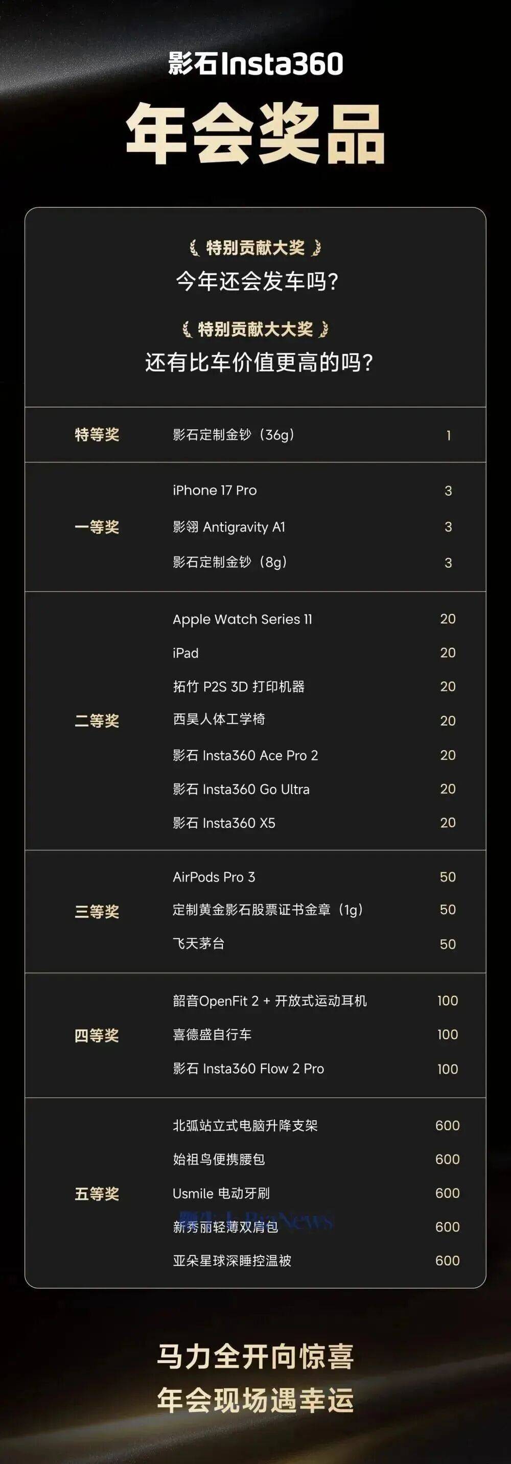 网上流传的影石Insta360年会奖品清单还显示,特等奖为36克影石定制金钞,一等奖则包含3台iPhone 17 Pro、3台影翎Antigravity A1以及3份8克定制金钞,各类奖品总数超3600份。