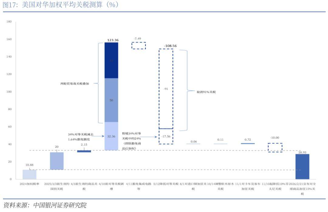 特朗普此前IEEPA关税被推翻,同时按122条款允许的最高幅度加征15%关税。当地时间20日,美国最高法院裁定,特朗普政府依据《国际紧急经济权力法》(IEEPA)实施的相关大规模关税措施缺乏明确法律授权。最高法院以6票对3票的投票结果裁定,1977年出台的IEEPA并未赋予总统在未经国会批准时征收关税的权力。20日特朗普签署行政令,依据美国《1974年贸易法》第122条,宣布对全球商品加征10%的进口关税,为期150天,2月24日生效,以取代稍早前被美国最高法院认定违法的一些紧急关税。当地时间2月21日,美国总统特朗普在其社交平台“真实社交”上发文称,将把对全球商品加征10%的进口关税的税率水平提高至15%。我们认为(1)当前美国对华的最新关税税率为28.93%,较2025年末约降低2.3个百分点;(2)全球贸易紧张形势缓和以及出口份额的提升,有望支撑我国出口增速的高韧性。