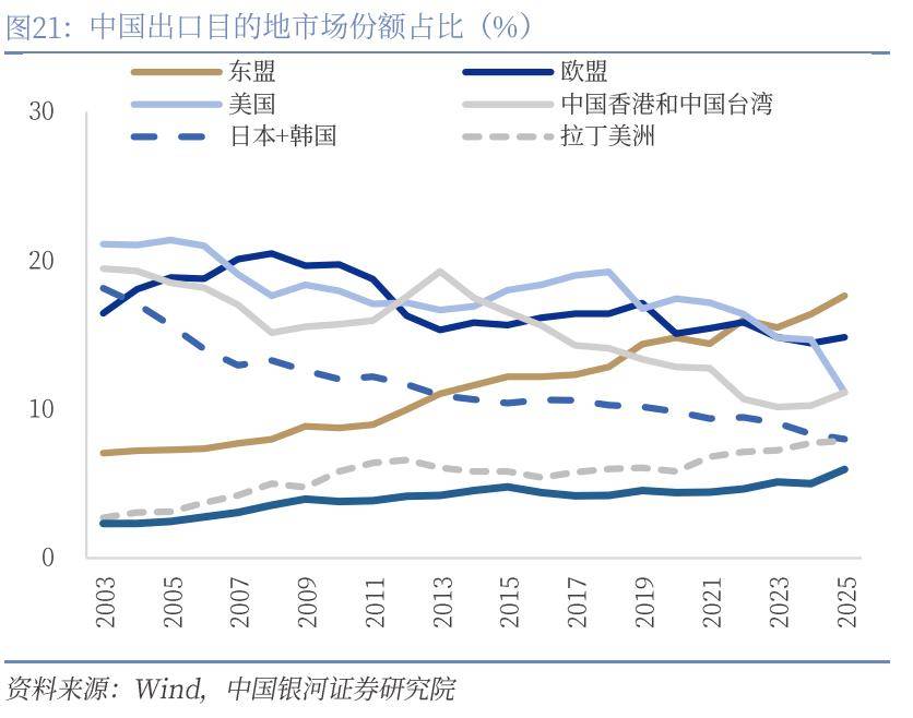 全球贸易紧张形势缓和以及出口份额的提升,有望支撑我国出口增速的高韧性。2025年4月特朗普实施全球“对等关税”,中国企业通过提升产品附加值、优化供应链布局、拓展新兴市场等方式增强竞争力,降低了美国关税政策的影响。2025年我国出口同比增长5.5%(2024年增速5.8%),保持较强韧性。在此前《十六张图看2026年出口》报告中,我们指出,从外部需求来看,全球经济复苏前景在地缘经济对抗等影响下依旧脆弱,全球贸易限制措施不断增加,其中中美经贸关系或迎来边际缓和,领先指标指向上半年我国出口仍强。从全球出口份额来看,我国出口产品竞争力和出口多元化等有利条件仍在强化。综合来看,我们认为2026年我国出口仍有望维持较强韧性,全年出口增速预计为5.4%。此次最高法裁定IEEPA关税失效,一方面短期内将削弱总统在贸易谈判中的即时威慑力,未来关税政策的覆盖面和灵活性将大不如前,这将在一定程度上缓和全球贸易环境的紧张程度。另一方面,对“芬太尼”关税的取消以及对全球商品统一加征15%的关税,或意味着我国有望凭借强大的供应链和产品竞争力进一步提升我国占全球的出口份额。