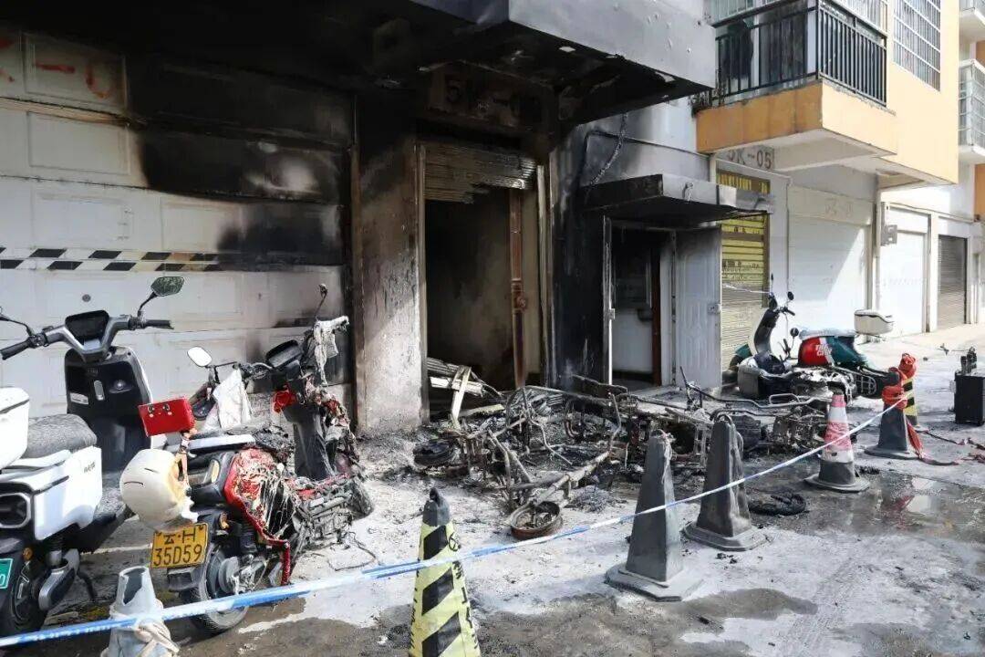 在火灾现场,5辆电动车被烧得只剩框架,2辆车身部件扭曲变形;充电用的移动电缆线被完全烧毁;一车库门金属结构因高温严重变形,整栋楼外墙被熏得焦黑。