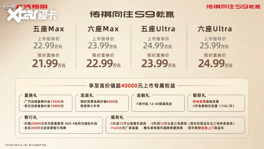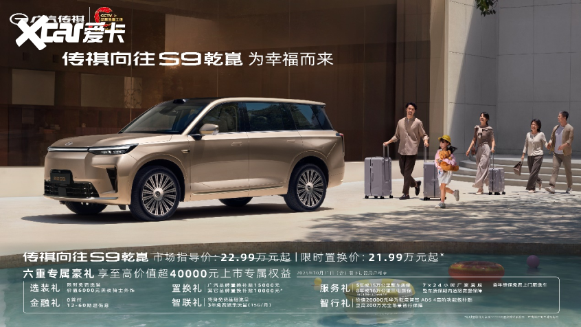 传祺向往S9乾崑上市指导价22.99万元起,可选五六座,满足不同用户购车需求。同时还为用户准备了六大诚意十足的上市礼包,综合价值超40000元。