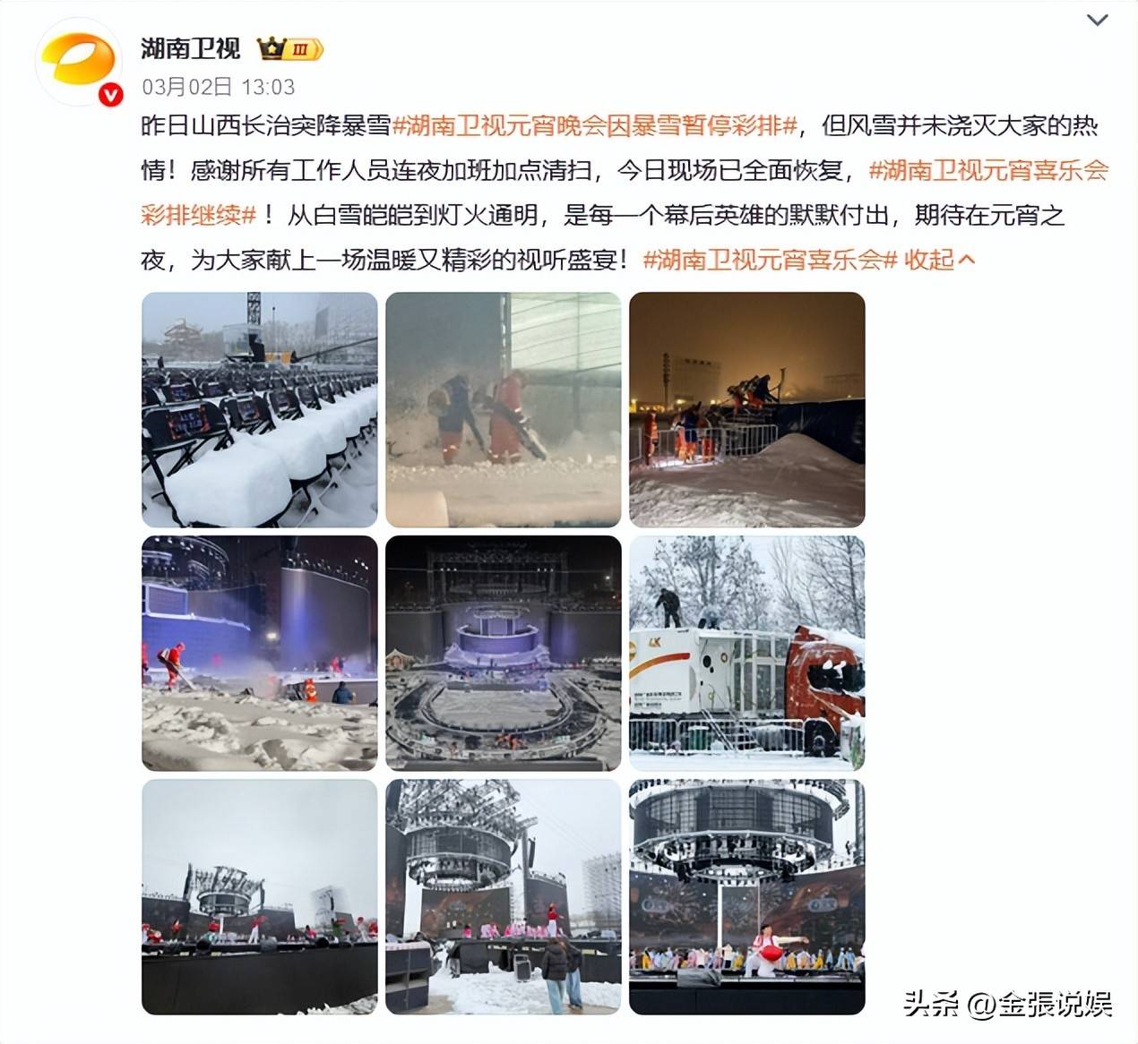 湖南卫视的户外晚会向来以场景壮观著称,但这一次,暴雪和低温把这场精心策划的演出搞得手忙脚乱。