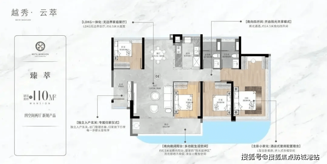 对于追求更高生活品质的改善型家庭,越秀云萃提供了建面约106㎡、110㎡的四房户型。106㎡户型南北通透,实际使用面积堪比天河125㎡户型,非常适合三代同堂居住;110㎡户型拥有14.5米的超大南向开间,LDKG无边界巨厅搭配6.5米长阳台,空间开阔大气,尽显豪宅风范。这两款户型在设计上更加注重空间的流动性和功能的完善性,满足了大家庭对舒适生活的向往。