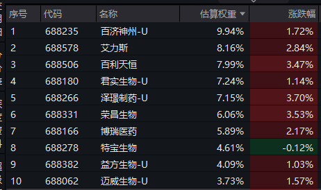 科创创新药ETF汇添富(589120)标的指数成分股涨跌不一,百利天恒、泽璟制药、荣昌生物等涨超3%,艾力斯等涨超2%,百济神州、君实生物等涨超1%,特宝生物等回调。