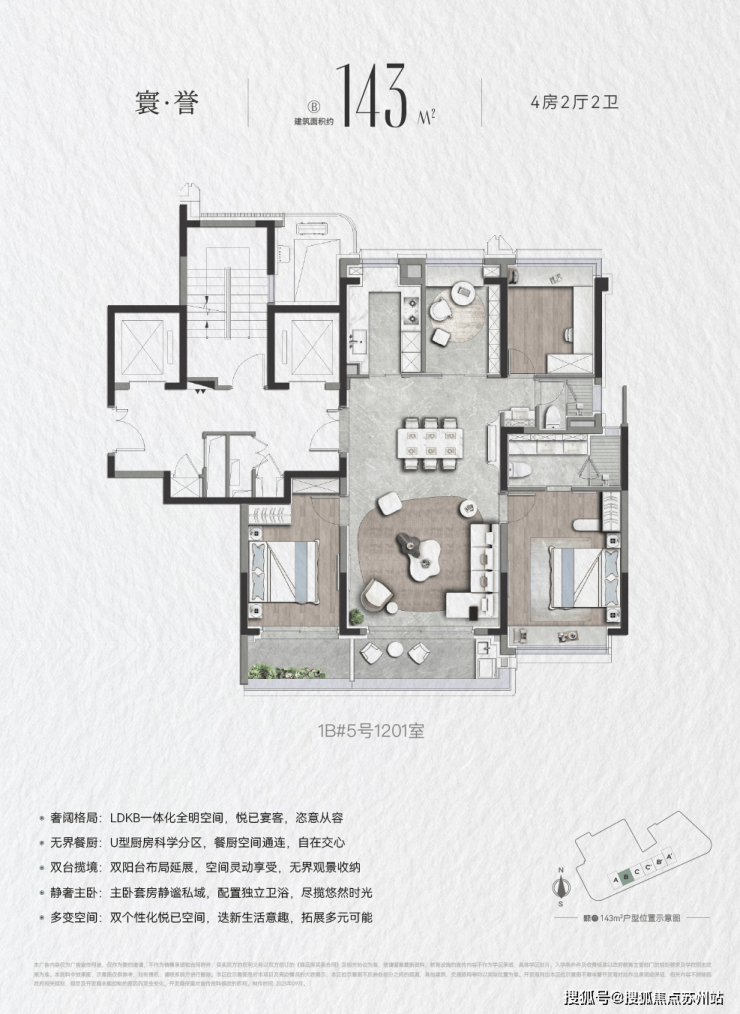 类一梯一户设计,提升私密性与尊贵感;飞机户型,全明设计,南北通透,三开间朝南,双阳台设计。