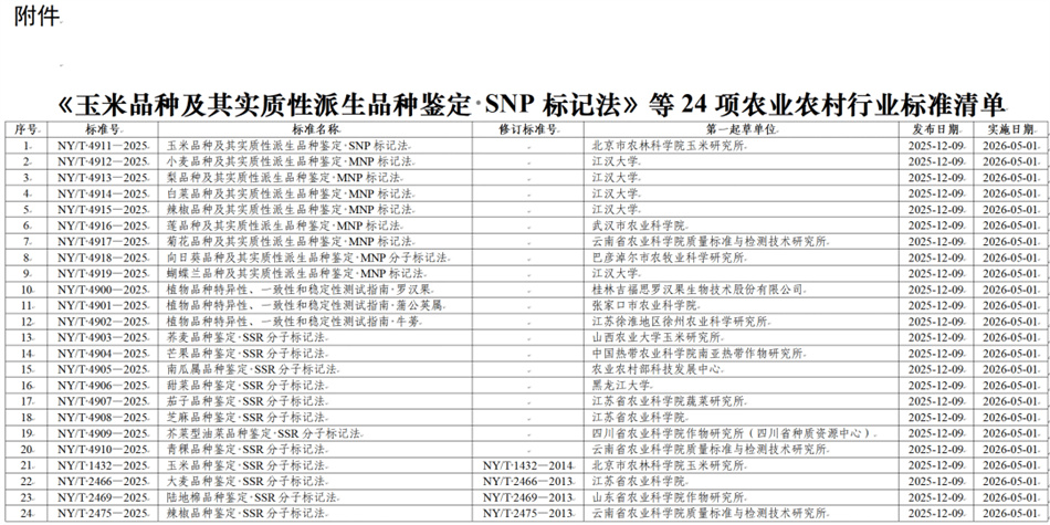由全国植物新品种测试标准化技术委员会归口管理的《玉米品种及其实质性派生品种鉴定SNP标记法(NY/T 49112025)》等24项农业行业标准,正式发布,并将自2026年5月1日起实施,标志着玉米种业实施实质性派生品种(EDV)制度向前迈出关键一步。