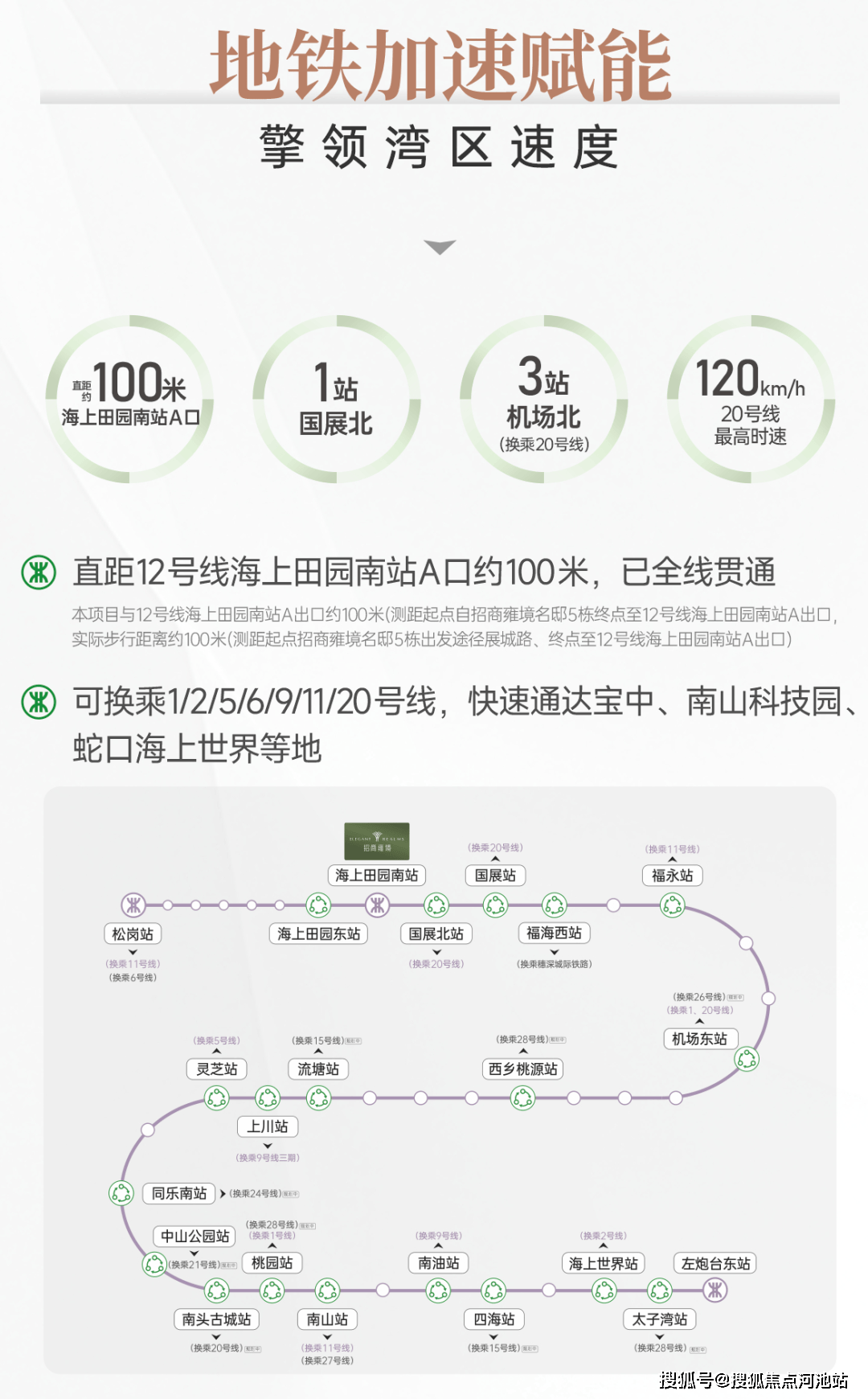 项目出门就是12号地铁线“海上田园南站”,步行约500米国展北站(12/20号线号线号线是机场快线,目前一期已通车,会展城站—机场北;二期已经纳入深圳地铁五期规划,预计28年通车,14站到高新园。
