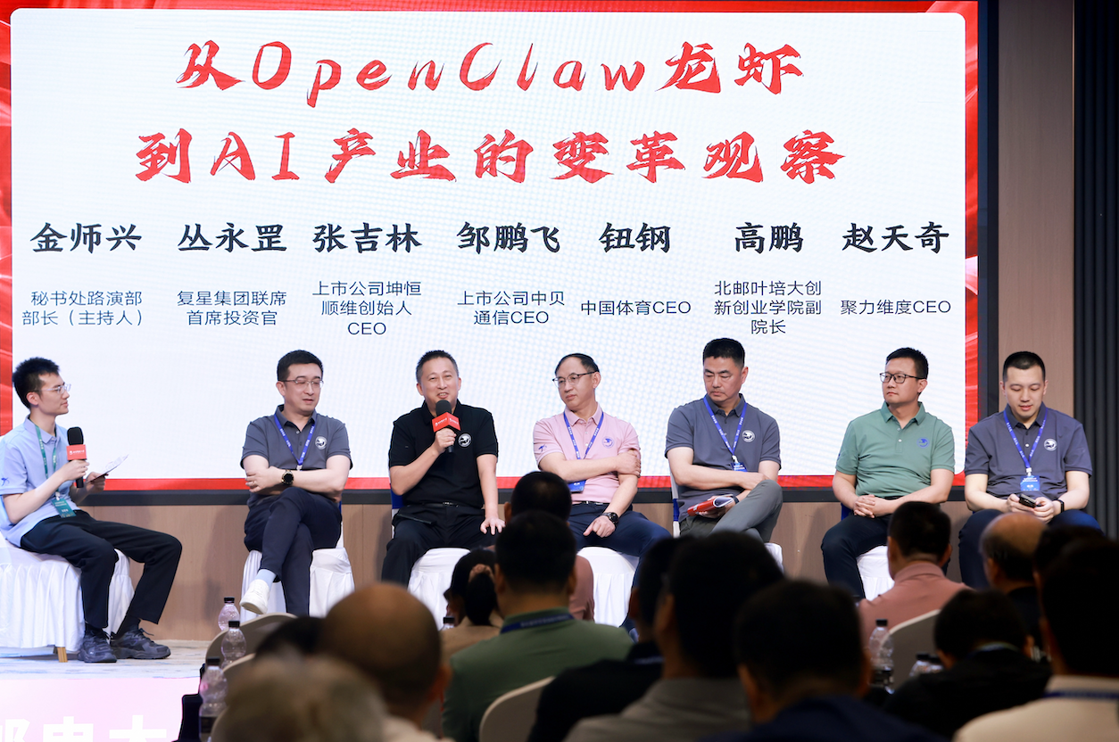 议题二为“从OpenClaw龙虾到AI产业的变革观察”,在各行业活跃的校友代表(复兴集团联席首席投资官丛永罡、坤恒顺维创始人CEO张吉林、中贝通信CEO邹鹏飞、中国体育CEO钮钢、北邮叶培大创新创业学院副院长高鹏、聚力维度CEO赵天奇),围绕AI基础设施、产业投资、场景应用、人才培养等维度展开深度探讨,为校友创业与母校人才培养建言献策。