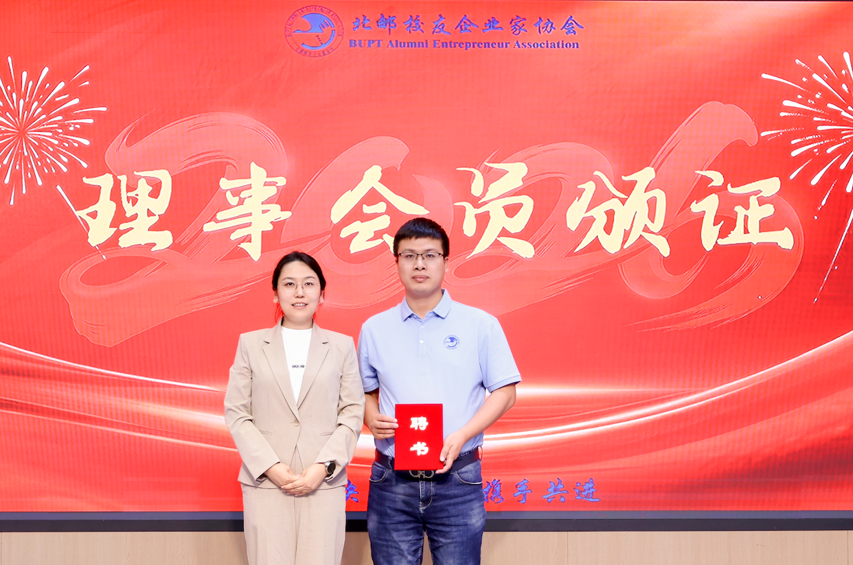 经北邮校友企业家协会常务理事会提名,增选张建胜为协会常务理事,北邮校友工作办公室主任张畅郁为新任常务理事张建胜颁证。