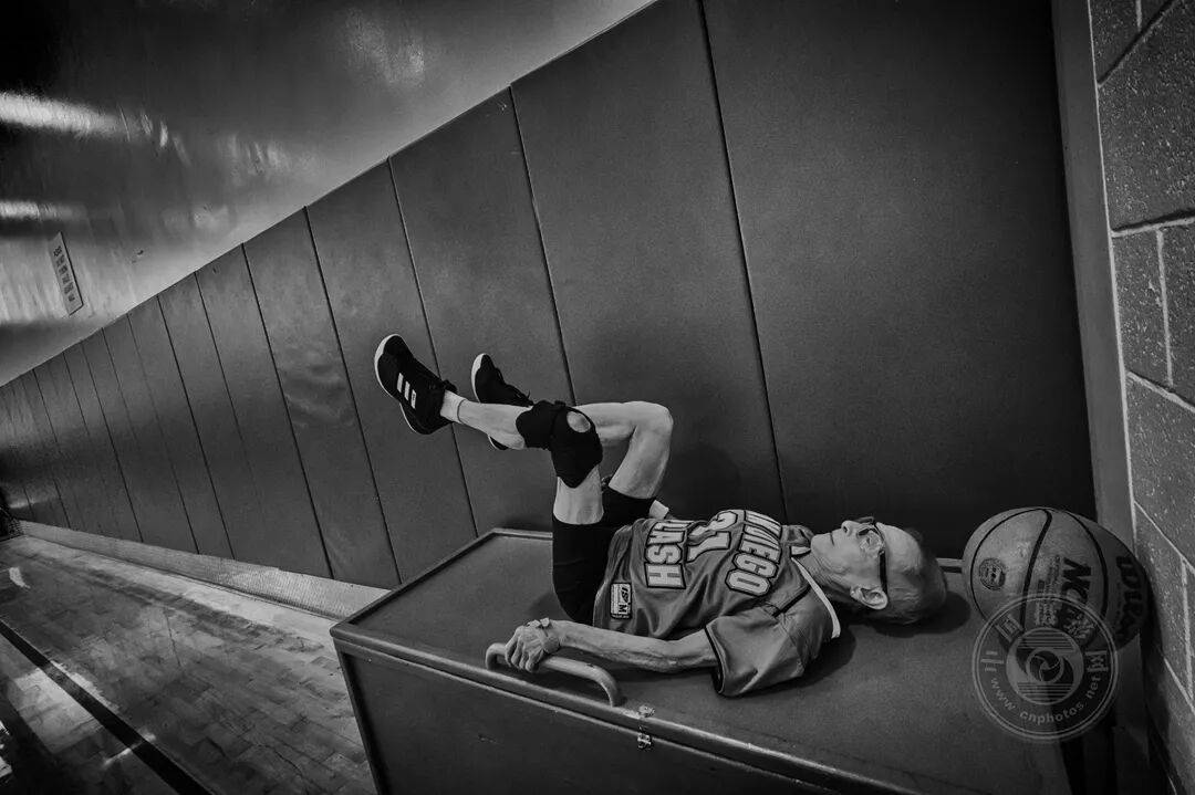 84岁的杰伊·汉利是圣地亚哥飞溅队球员,赛前在场边进行拉伸。她曾因竞走反复受伤,于是寻求其他运动,并于2017年加入球队。杰伊坚定认为,篮球对身体更友好,她每周打球四天。她表示,在老年女子篮球协会打球最美好的部分,是收获的友谊。