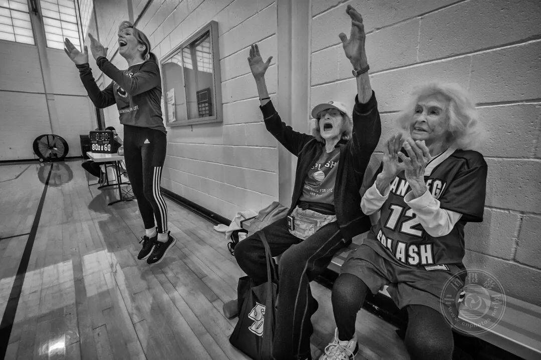 圣地亚哥飞溅队教练CJ·莫洛尼欣喜雀跃,队中队友96岁的玛吉·卡尔(中)与99岁的格蕾丝·拉森(右)在替补席上欢呼助威。格蕾丝是联赛中最年长的球员,她从78岁才开始打篮球,她表示:“成长的年代里,我们根本没有机会打球。”