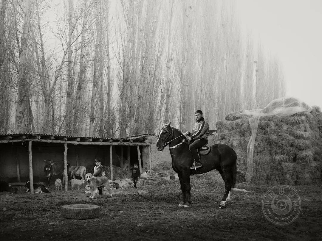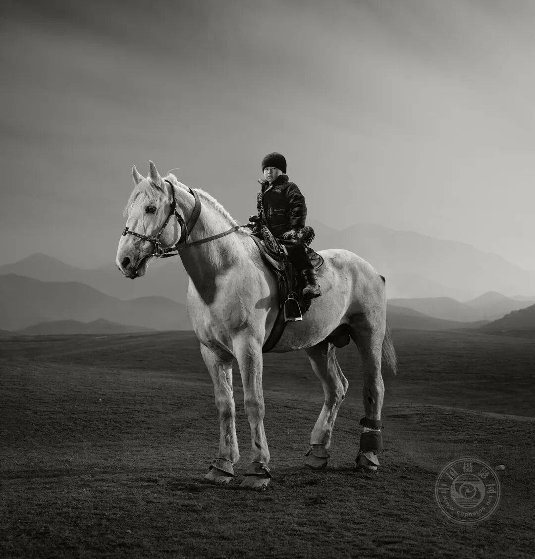 4岁的阿卜杜卡迪尔,在山顶一片宁静的瞬间被拍下,而下方狭窄的山谷中,马背叼羊比赛正激烈轰鸣。摄影师当时正在架设闪光灯设备,为阿卜杜卡迪尔所在群体的几名骑手拍摄肖像。这时,他主动独自走上前来,骑着自己的高头大马踏入临时摄影区,双脚距离真正够到马镫只差一点点。