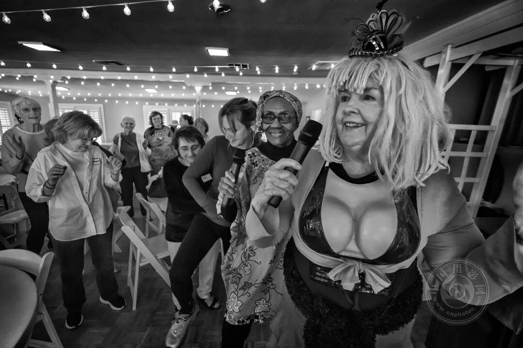 在圣地亚哥老年女子篮球协会(SWBA)年会尾声,84岁的金女郎队队长珍妮·赫尔利以其另类自我“萨西”的身份,用一段即兴表演为活动收尾。86岁的金女郎队球员玛丽莲·A·戴(昵称 “戴妈妈”)与她同台演出。