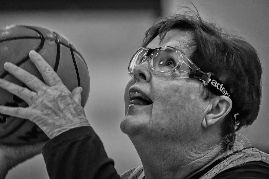 84岁的珍妮·赫尔利是金女郎队队长,正瞄准投篮。珍妮自愿担任队长,她笑着说:“没人愿意干这个活儿。” 但事实上,她喜欢统筹安排,负责行程规划、督促大家准时训练,这些都很适合她。赛场之外,她仍担任临床社会工作,专注于心理健康与药物相关问题的辅导工作。